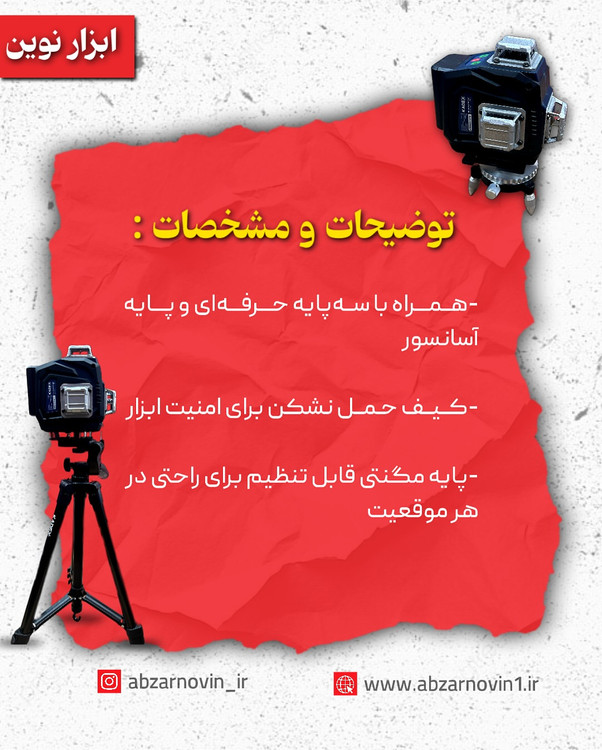 این تراز لیزری دارای سه پایه آسانسوری و کیف حمل نشکن است و پایه مگنتی قابل تنظیمی دارد.